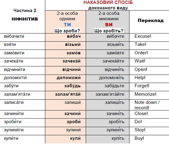 - Таблиці, де подано дієслова доконаного і недоконаного виду в 2-ій особі однини та множини + переклад англійською.