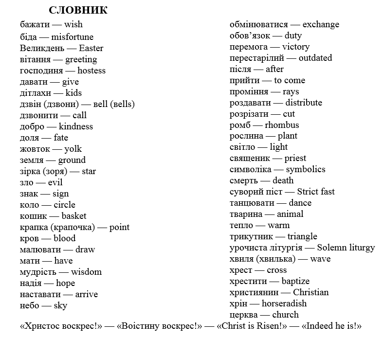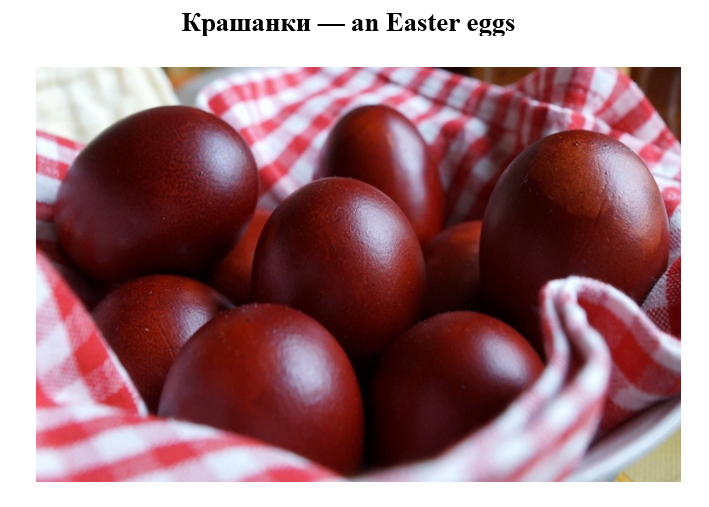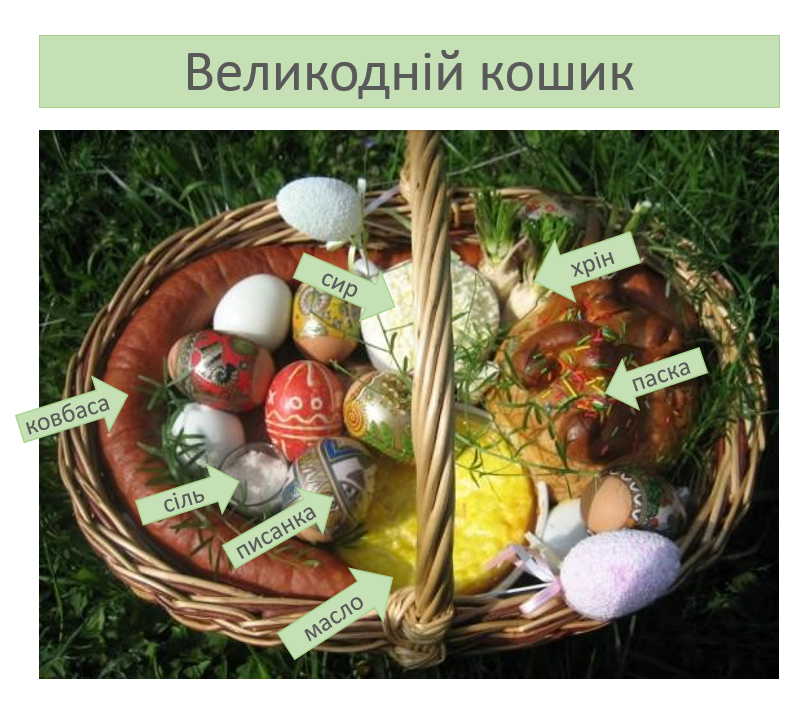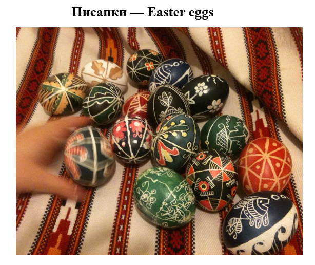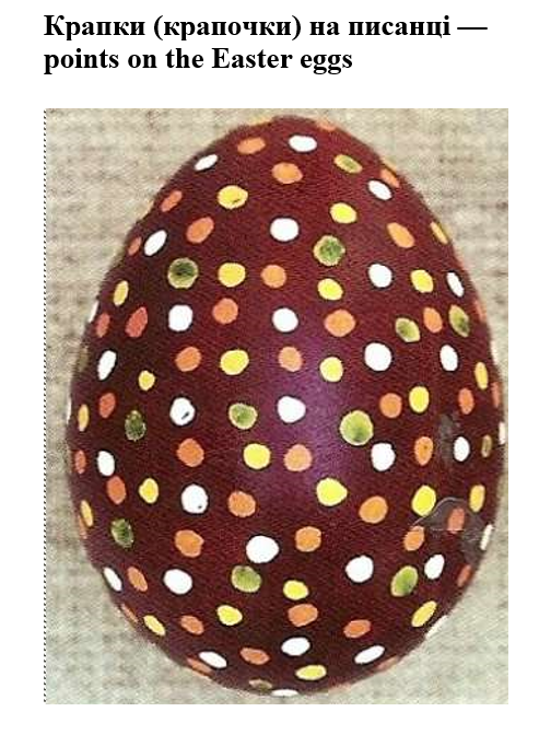 Крашанки — це курячі яйця, пофарбовані в червоний або жовтий колір, а писанки — курячі яйця, розмальовані певним орнаментом. Українці зображували сонце у вигляді кола з променями. Ще вони малювали хвильки, ромби, трикутники, тварин, рослин. Кожен знак на писанці щось означав: крапочки — дощ і небесні зорі, хвильки — життєві дороги; червоний колір — кров, жовтий — сонце, зелений — надію, синій — небо.