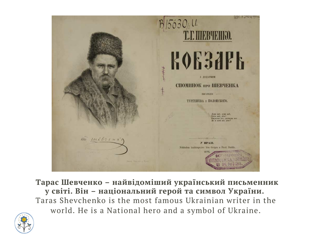 Тарас Шевченко – найвідоміший український письменник у світі. Він – національний герой та символ України. Taras Shevchenko is the most famous Ukrainian writer in the world. He is a National hero and a symbol of Ukraine.